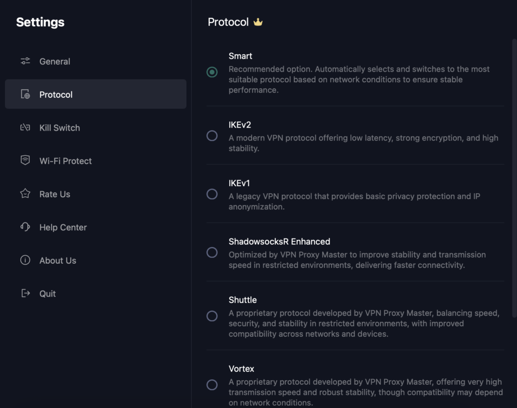 В настройках можно переключаться между протоколами (например, IKEv2 или WireGuard).